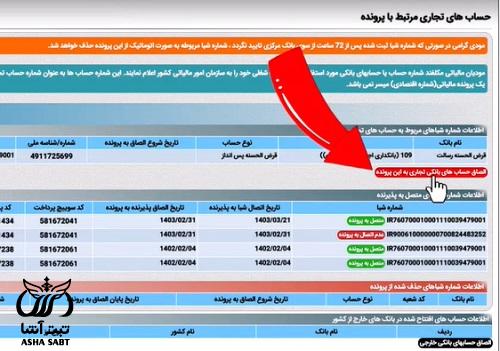در مرحله بعد، از منوی بالای صفحه، گزینه "حساب ها" انتخاب می شود و کاربر می تواند با انتخاب گزینه "الصاق حساب های بانکی تجاری به این پرونده"، اقدام به افزودن یا ویرایش شماره شبای موردنظر کند. پس از وارد کردن شماره شبا، لازم است گزینه "بررسی و ذخیره" را انتخاب کند تا سیستم به صورت خودکار اعتبار حساب را بررسی کرده و در صورت تایید، آن را به عنوان حساب بانکی تجاری ثبت کند. (راهنمای تصویری این امر، در قسمت قبلی مقاله، توضیح داده شده است.)