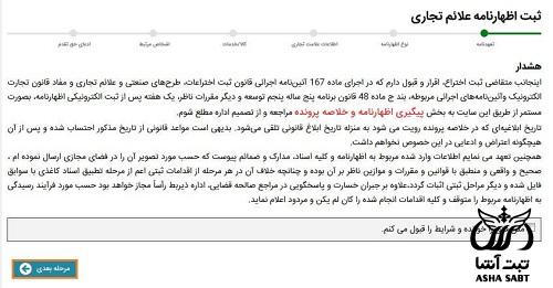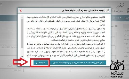 سپس پیغامی مشابه متن تصویر زیر نمایش داده می شود که لازم است متقاضی آن را مطالعه کرده و با انتخاب گزینه «متوجه شدم» وارد مرحله بعد شود. همچنین امکان مشاهده قوانین مرتبط نیز در همین بخش وجود دارد.