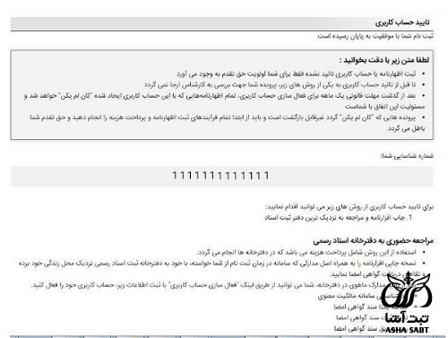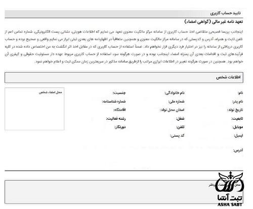در مرحله پایانی ثبت نام، متقاضی باید نسخه چاپ شده اقرار نامه را به همراه مدارک هویتی به یکی از دفاتر اسناد رسمی ارائه دهد تا نسبت به دریافت گواهی امضا اقدام شود. سپس از طریق گزینه تایید حساب کاربری با گواهی امضا و وارد کردن اطلاعات مورد نیاز، حساب کاربری فرد فعال می گردد.