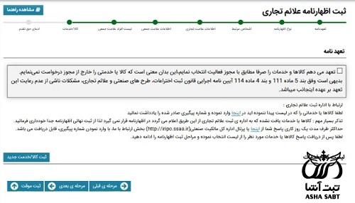 بعد از انتخاب این گزینه در سامانه ثبت برند و لوگو ipm ssaa ir، صفحه ای شامل تعهدنامه نمایش داده می شود. برای ادامه مراحل، فرد باید گزینه متن فوق را خوانده و شرایط را قبول دارم را فعال کرده و سپس بر روی مرحله بعدی کلیک کند.