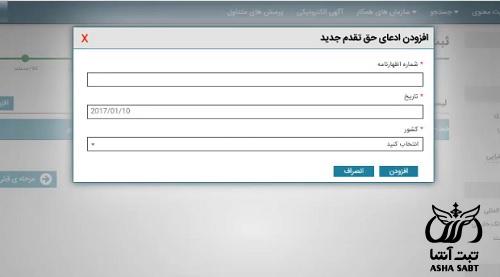 پس از انتخاب این گزینه، پنجره ای مطابق تصویر زیر نمایش داده می شود که لازم است شماره اظهارنامه، نام کشور و تاریخ ثبت علامت در محل های مشخص وارد گردد.