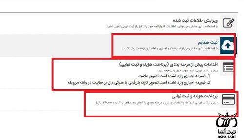 پس از ثبت اطلاعات، کاربر وارد بخش ویرایش اطلاعات و بارگذاری ضمائم می شود. در این قسمت باید مدارک لازم مانند تصویر علامت، کارت بازرگانی و مدارک هویتی بارگذاری گردد. همچنین هزینه ثبت برند نیز از همین بخش قابل پرداخت است.