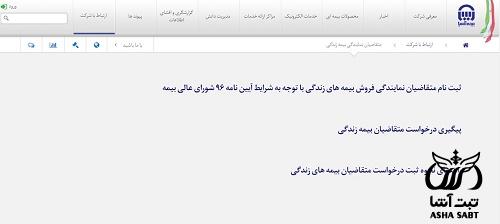 در صفحه ارائه شده، شخص متقاضی می بایست بر گزینه ثبت نام متقاضیان نمایندگی فروش بیمه های زندگی کلیک نماید.