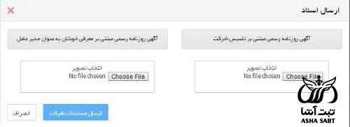 با انتخاب گزینه «ادامه»، فرم زیر به متقاضی نمایش داده خواهد شد. متقاضی باید در این قسمت با انتخاب گزینه «Choose File» تصویر آگهی های روزنامه رسمی شرکت و تصویر آگهی رسمی که در آن متقاضی به عنوان مدیر عامل شرکت مربوطه معرفی شده را بارگذاری نماید. با انتخاب گزینه ارسال مستندات، این اسناد جهت بررسی ارسال خواهند گردید و نتیجه بررسی، از طریق پیامک به شماره تلفن همراه وارد شده در فرم ثبت نام، اطلاع رسانی خواهد شد.