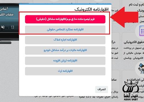 پس از آن، شخص باید با توجه به نوع شخصیت خود یکی از دو گزینه "فرم تبصره ماده 100 ق.م.م/اظهارنامه مشاغل (حقیقی)" یا "اظهارنامه عملکرد اشخاص حقوقی" را برگزیند.