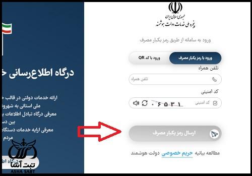 فرد در این قسمت، باید بین گزینه های شخص حقیقی و حقوقی یک مورد را انتخاب نموده، در بخش بعدی بایستی به پنجره ملی خدمات دولت هوشمند وارد شود. در همین راستا، شماره تلفن همراه و عبارت امنیتی را وارد کرده و بر روی دکمه ارسال رمز یک بار مصرف ضربه می زند.