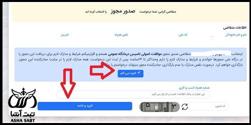 شخص با ورود به مرحله بعد، ضوابط، شرایط، قوانین و استعلامی های مورد نیاز را مطالعه کرده و سپس بایستی بر روی دکمه درخواست صدور مجوز به رنگ آبی ضربه بزند.